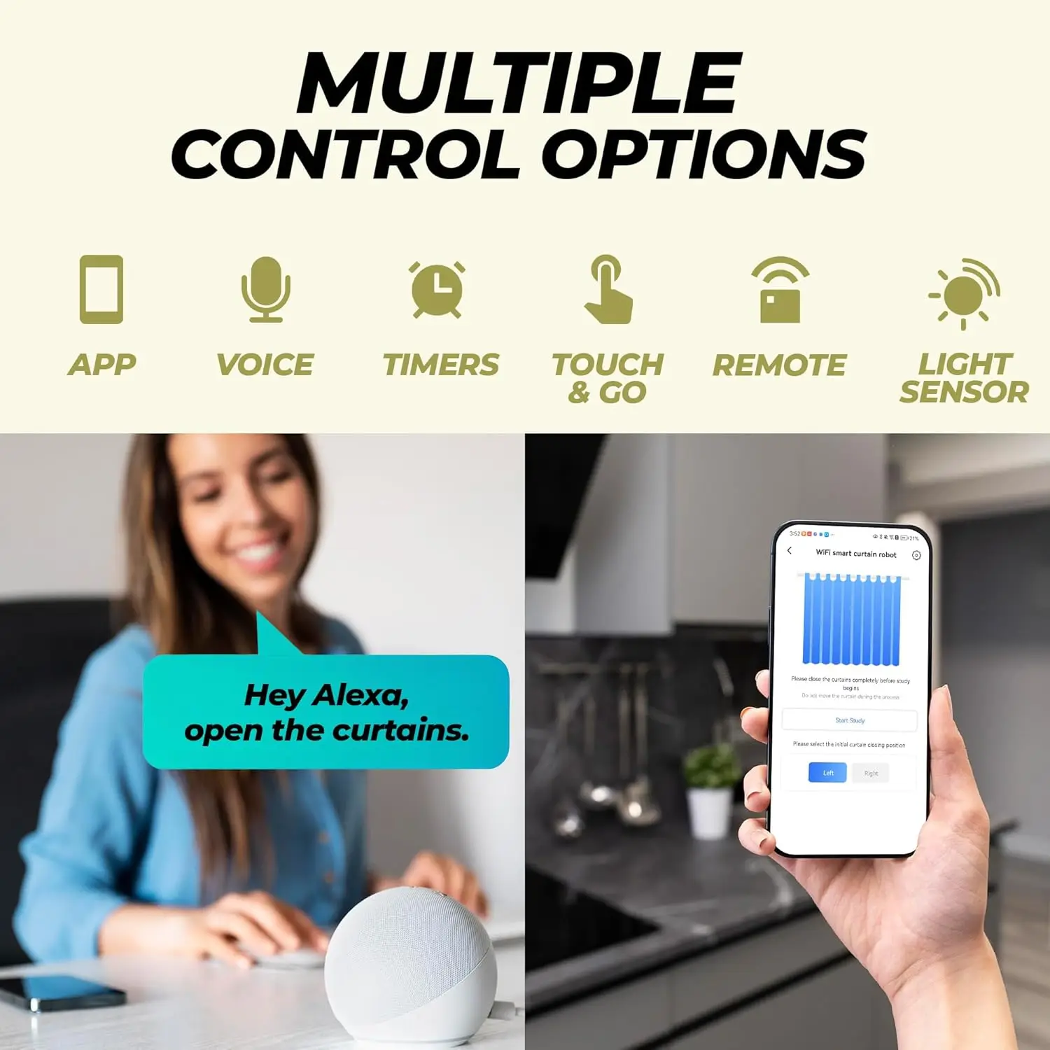 - Multiple Control Options: Manage your curtains with ease using our app, which lets you control opening, closing, and open percentage. Set custom schedules for fully automated curtains. you can also use Smartlife, Alexa, Google Home, SmartThings, Siri Shortcuts, and IFTTT . Note that two units are necessary if your curtains open in the middle.