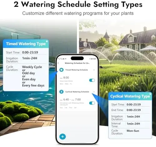 - Two Smart Watering Modes: Choose between Timed Watering Mode for precise scheduling — set start times, duration, and frequency (daily, weekly, odd/even days, or every few days). Or use Cyclical Watering Mode to automate short bursts of irrigation within a defined timeframe by configuring intervals, duration, and start/end times — perfect for young plants or drought-prone areas.